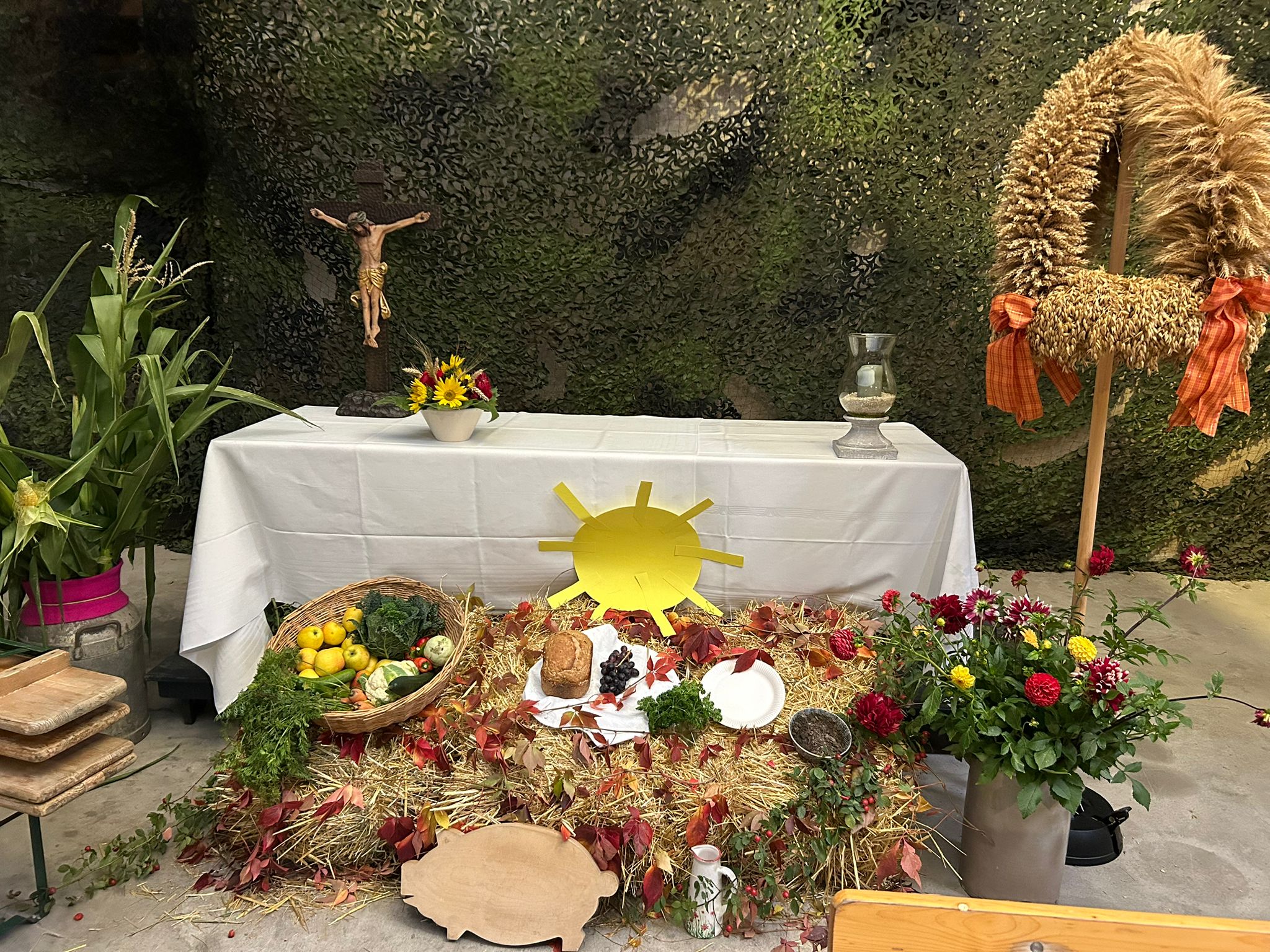 In diesem Jahr wurde die Erntedankmesse auf dem Hof Nölle-Leifert gefeiert. Zu Beginn des Gottesdienstes hieß es: „An Erntedank schauen wir auf die Natur und alles, was sie uns schenkt – auf die Lebensmittel, die wir essen, auf die Menschen, die arbeiten, damit wir satt werden.“