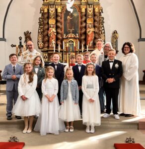 Die erste Heilige Kommunion empfingen: Henri Bialas, John Diehl, Fiete Göke, Matthias Hedrich, Alessandro Kil, Joana Meier, Maja Michehl, Amy Mohr, Merle Schmidt, Matteo Vitale