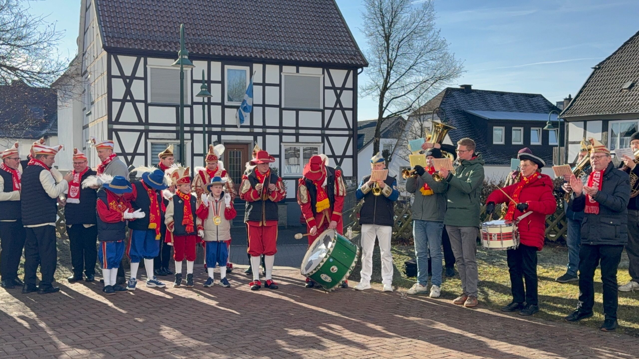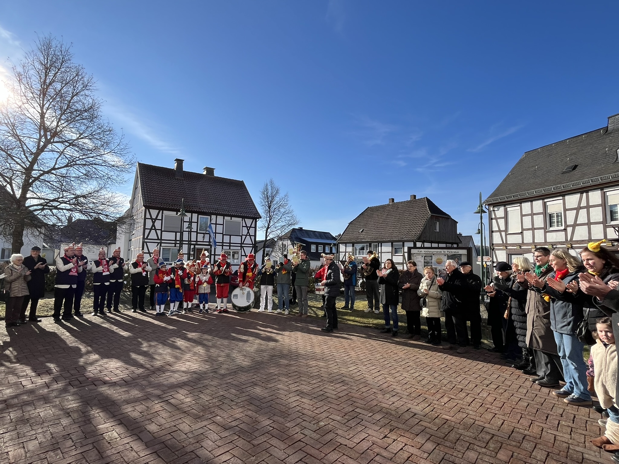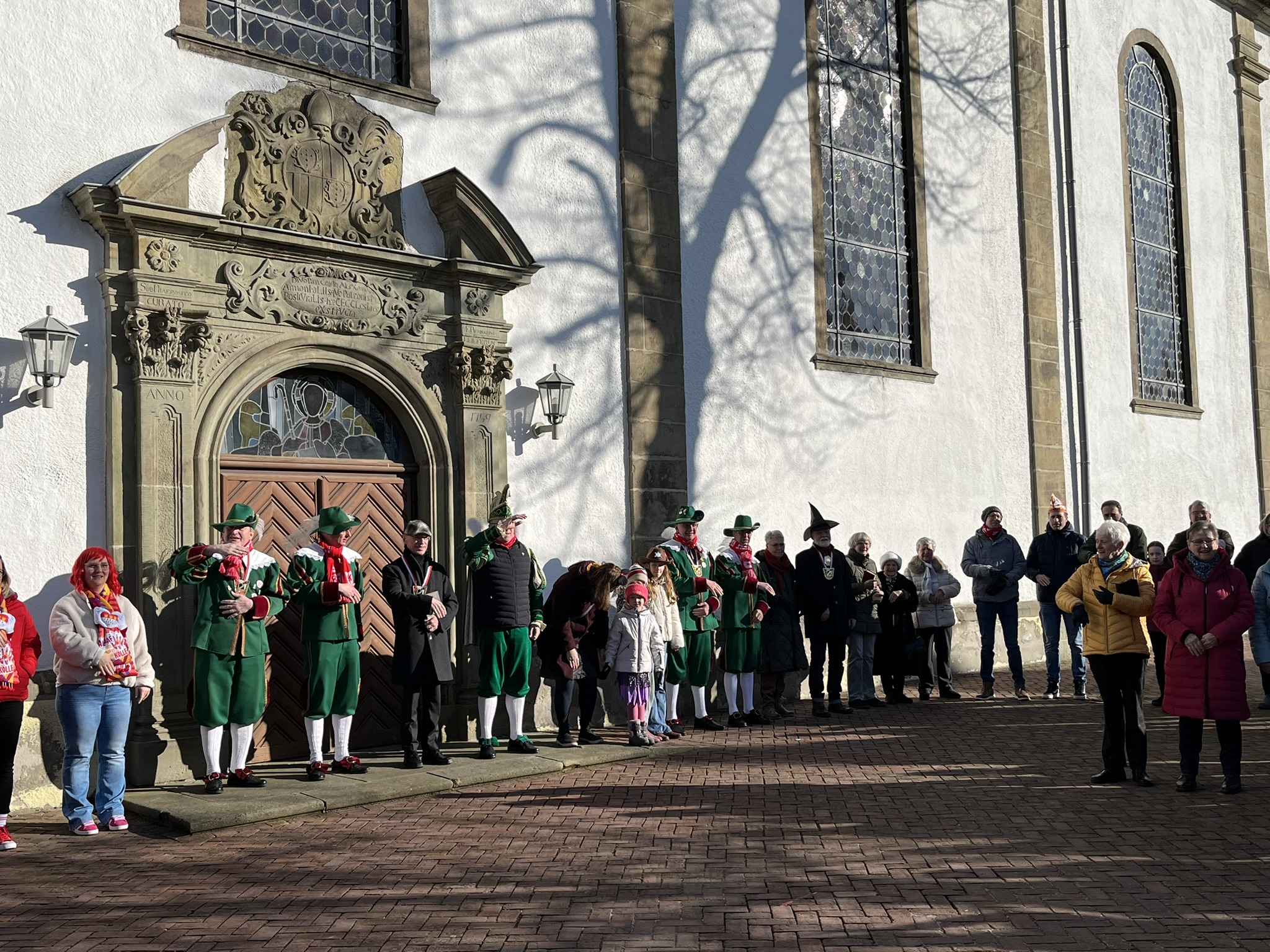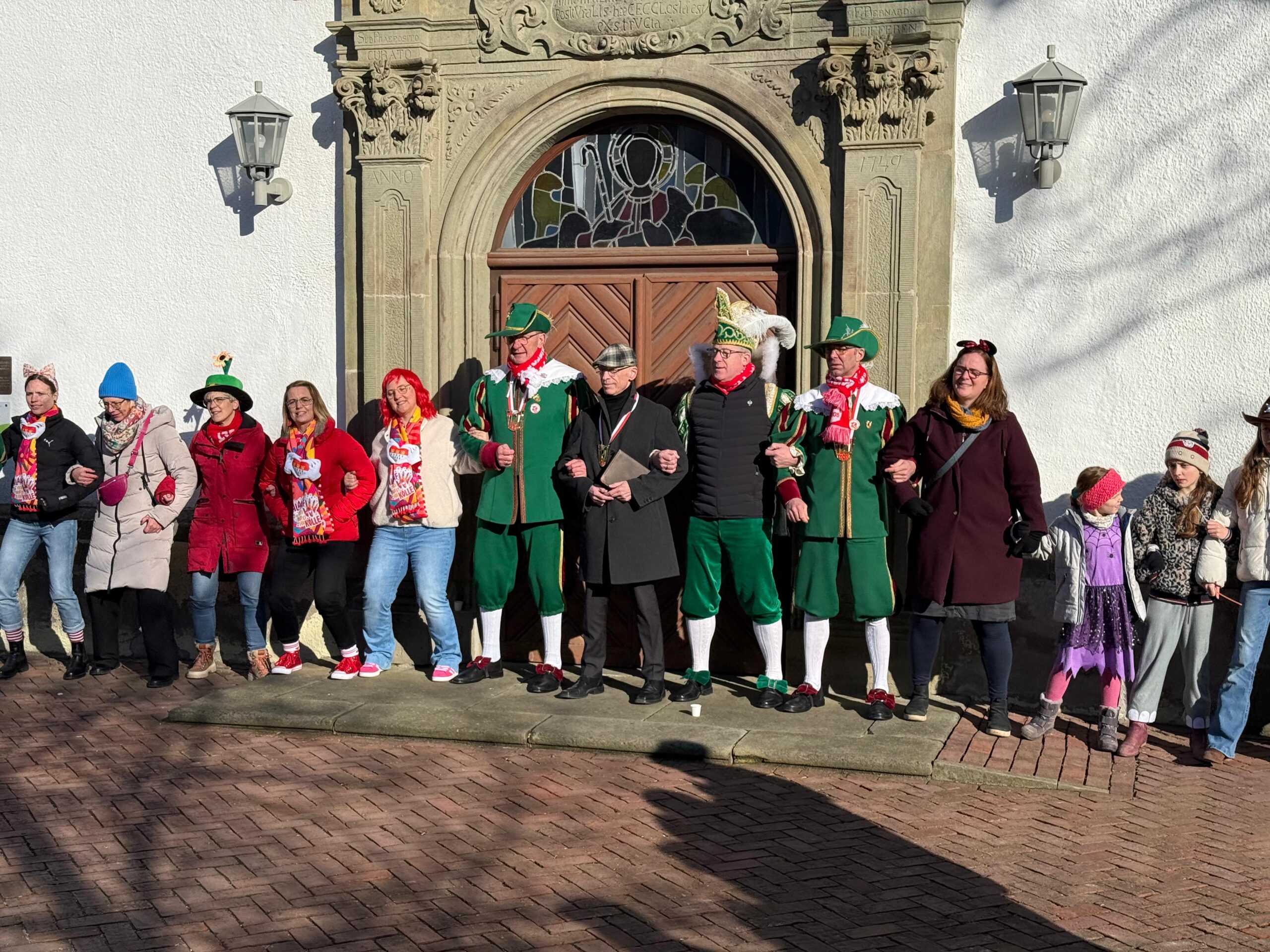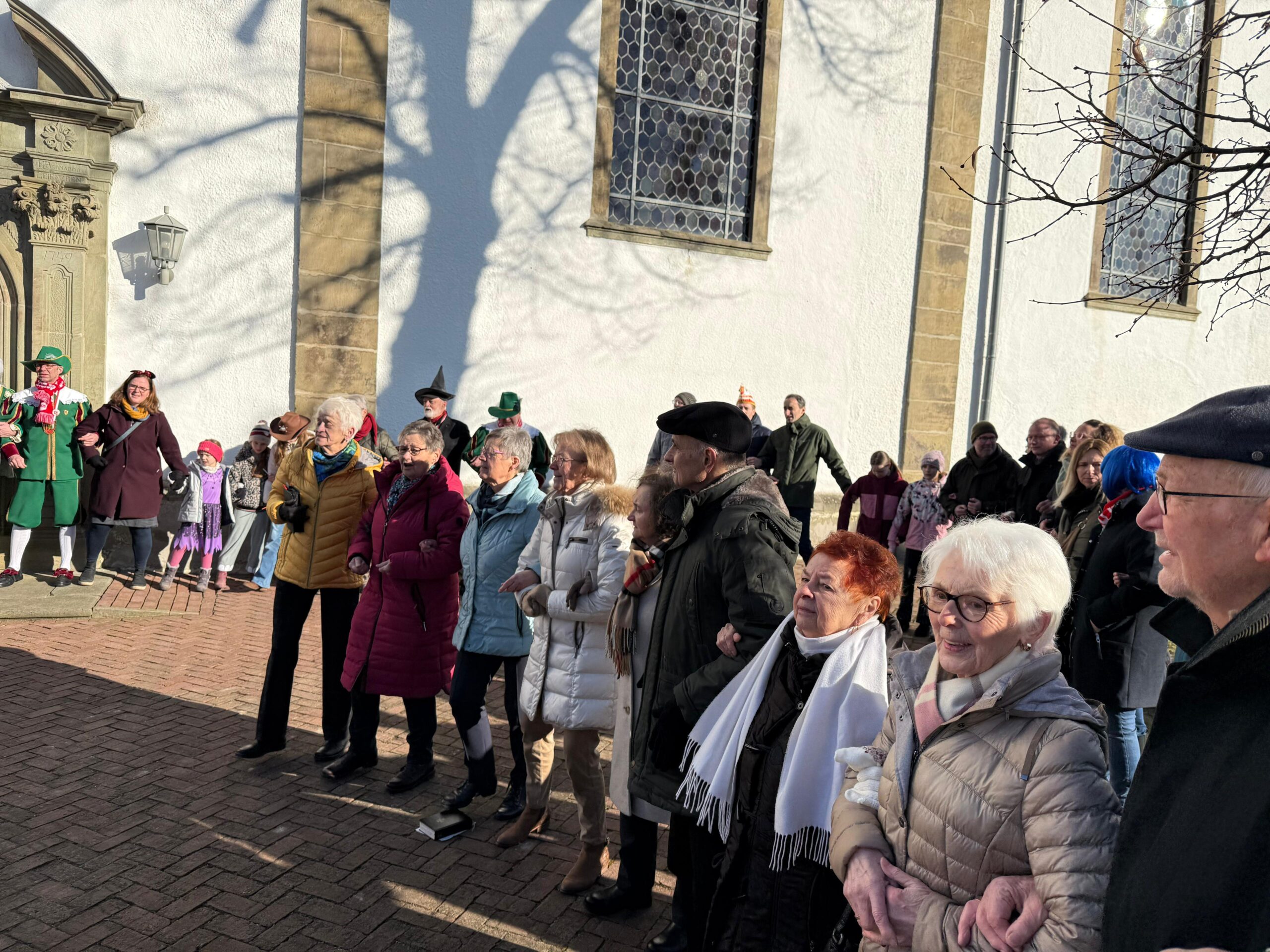 Nach dem Gottesdienst wurde auf dem Kirchplatz geschunkelt. „Wir schunkeln uns schon mal für heute Nachmittag ein“, stellte Christoph Sellmann fest und lud für 17 Uhr zum traditionellen Schunkeln in der Altstadt sowie zum Rosenmontags-Umzug ein. Musikalisch wurde das Schunkeln auf dem Kirchplatz von einer Abordnung der Belecker Musikvereinigung und Hasi Raulf begleitet.