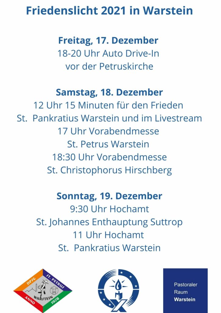 Am 4. Adventssamstag, 18. Dezember, werden die Belecker Pfadfinder das Licht im Rahmen der Vorabendmesse um 18.30 Uhr in der Heilig-Kreuz-Kirche an alle verteilen, die am „Friedensnetz“ mitknüpfen und so auch Botschafter des Friedens werden wollen.