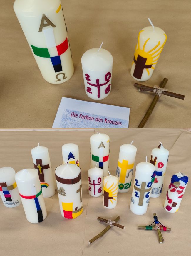 Alle TeilnehmerInnen erhielten zu Beginn ein einfaches Holzkreuz, das in verschiedenen Stationen mit farbigen Bändern versehen wurde. Im Anschluss an den Kreuzweg bastelte die Gruppe bunt gestaltete Osterkerzen.