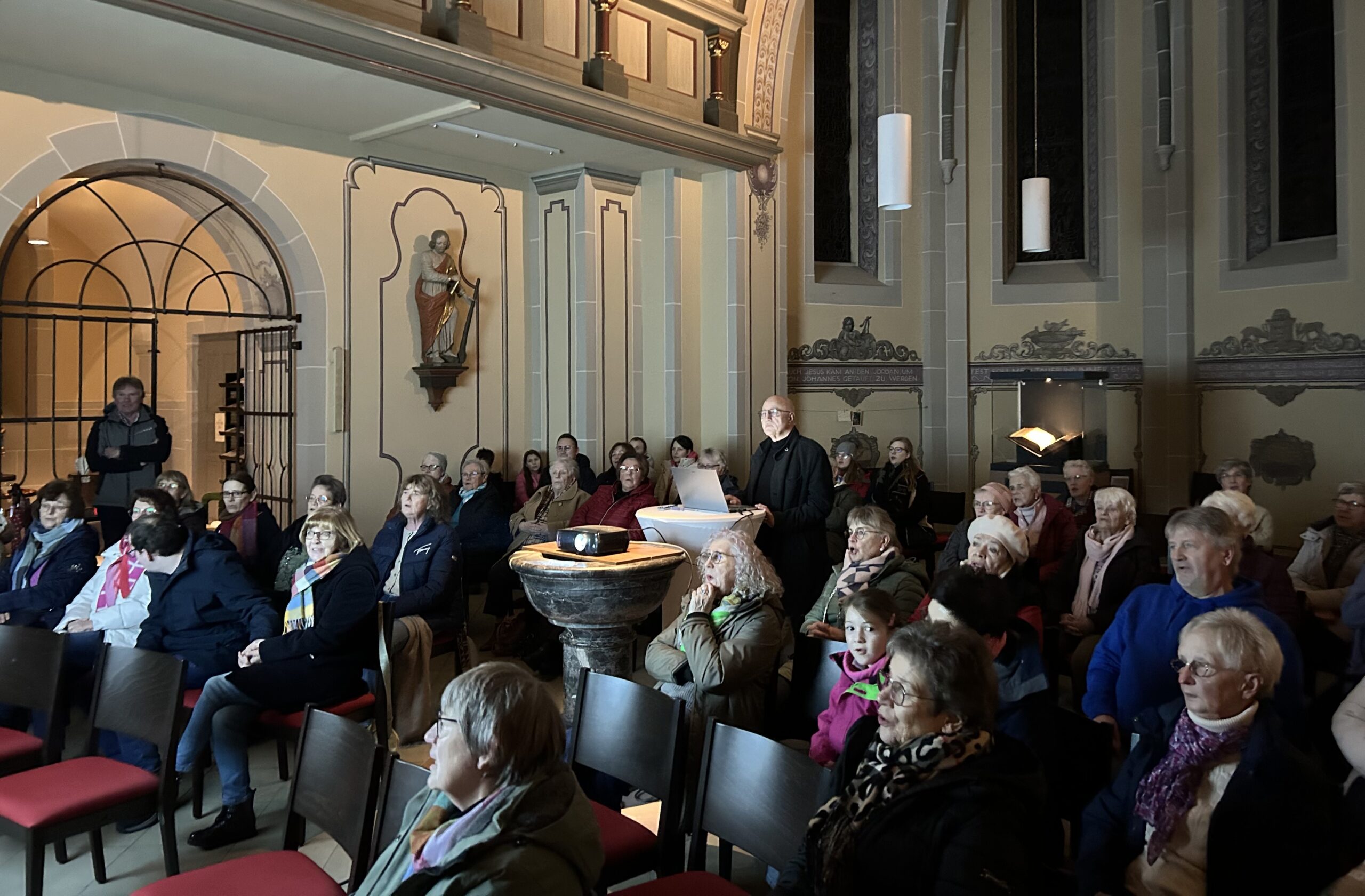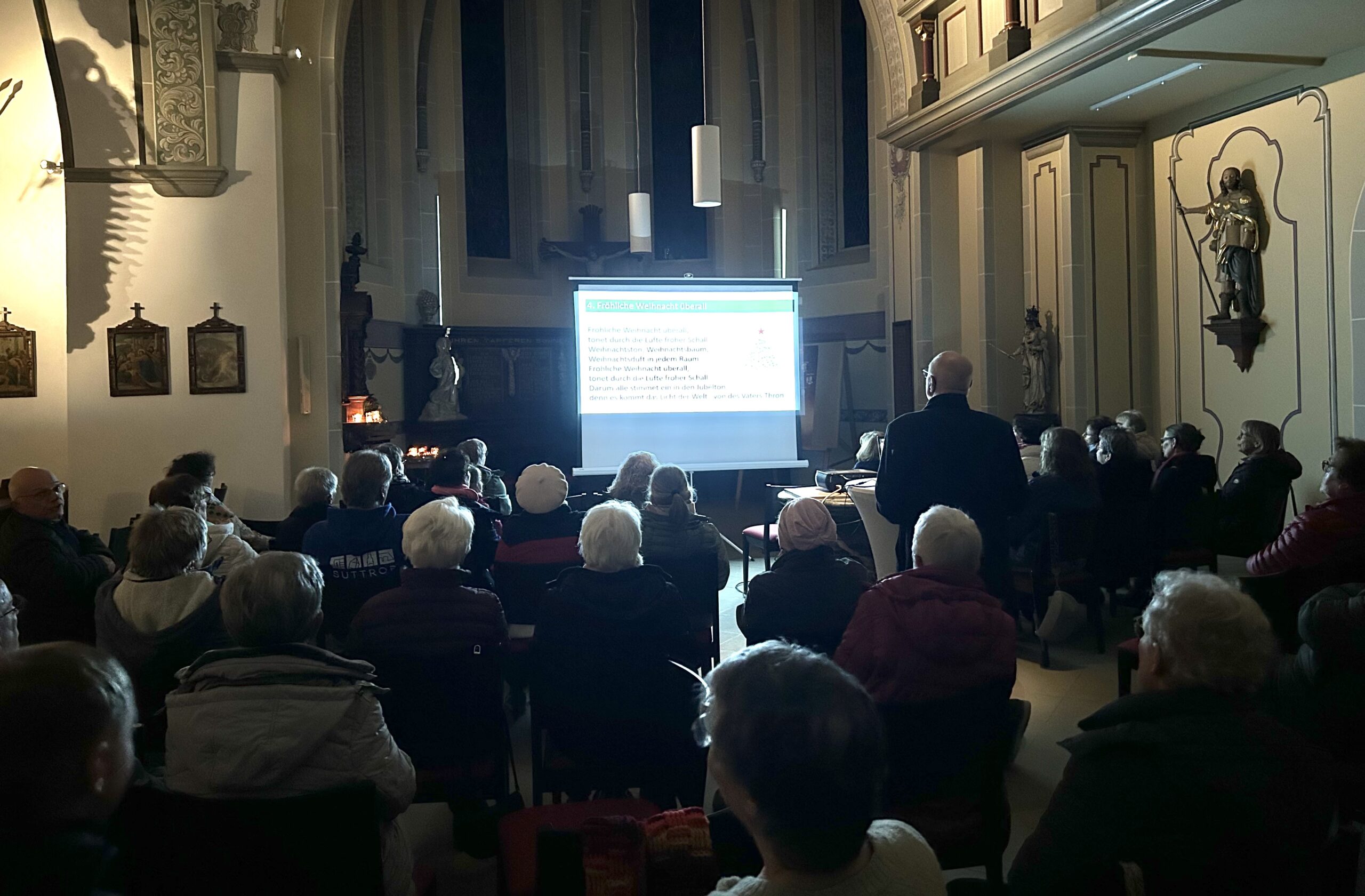 Es gab kaum eine Pause zwischen den vielen Liedern und es wurde direkt weiter gesungen. Neben klassischen Weihnachtsliedern wie „Kommet ihr Hirten“, „Alle Jahre wieder“ und „Macht hoch die Tür“ wurde auch das englische Lied „Jingle Bells“ gesungen. Der Text zu den Liedern und deren einzelnen Strophen war auf einer Leinwand zu sehen, sodass alle mitsingen konnten. Daraufhin folgte noch eine weitere kleine Geschichte mit Impulsen für die restliche Advents- und Weihnachtszeit.