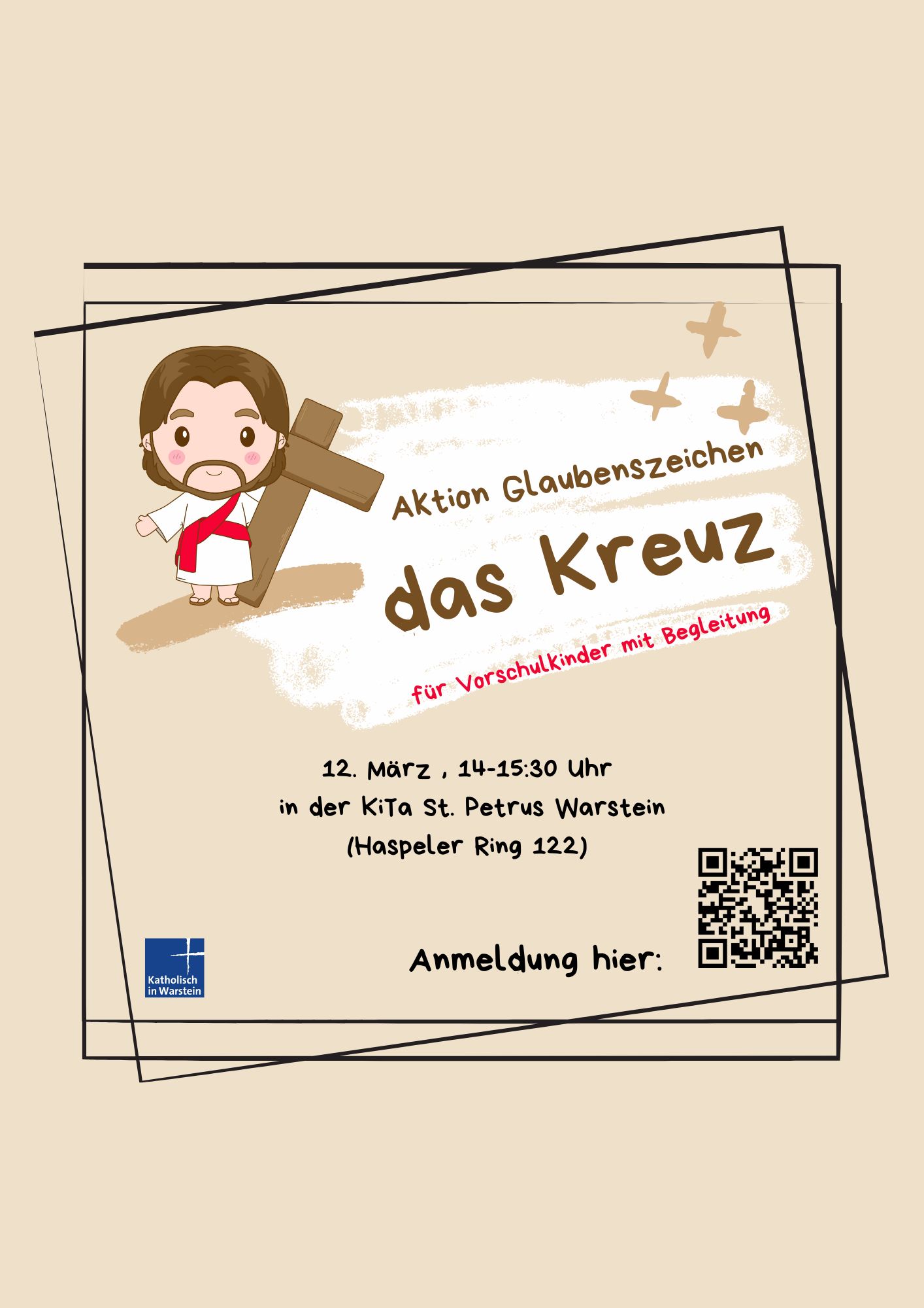 Auch in diesem Jahr bietet die KiTa St. Petrus Warstein in Zusammenarbeit mit Gemeindereferentin Bernadette Kauf wieder eine Aktion Glaubenszeichen für Vorschulkinder an. Eingeladen sind alle Kinder, die im kommenden Sommer in die Schule kommen und sich mit einem der wichtigsten christlichen Glaubenszeichen, dem Kreuz, näher beschäftigen wollen.