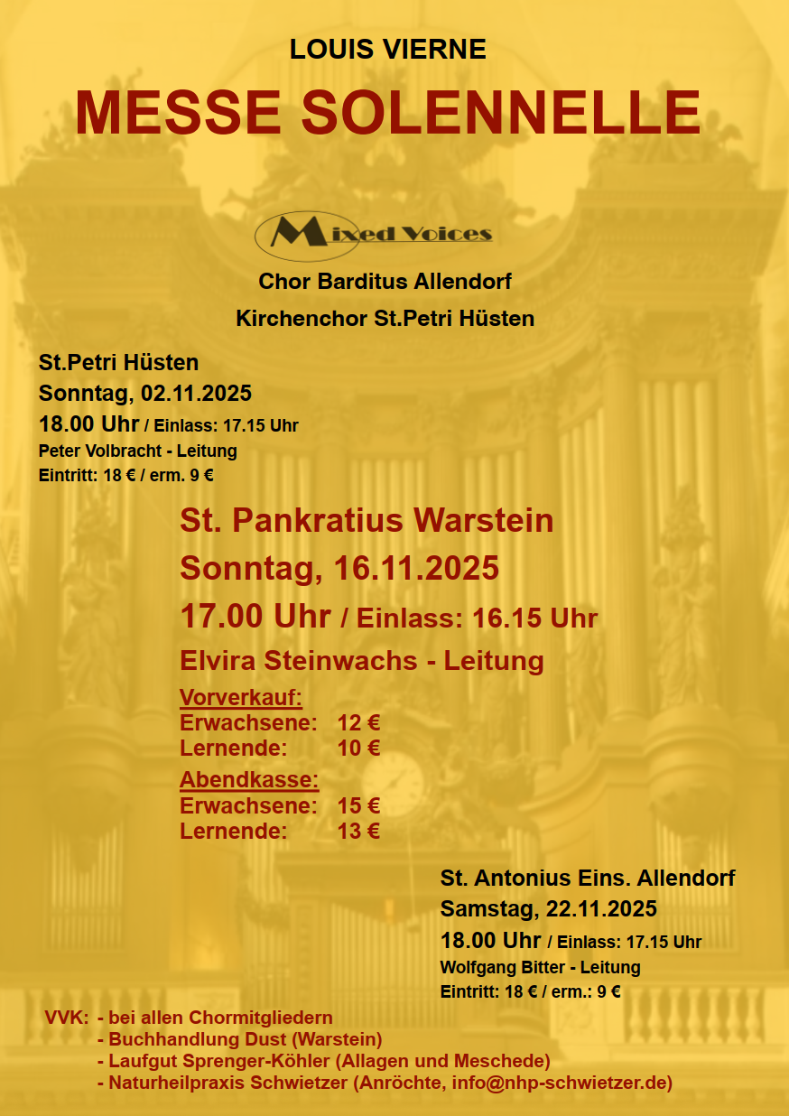 Zu einem großen Chor- und Orgelkonzert lädt der Chor Mixed Voices am 16.11.2025, um 17.00 Uhr in die Kirche St. Pankratius in Warstein ein. Aufgeführt wird die Messe Solennelle von Louis Vierne sowie Werke von Widor, Duruflé, Rheinberger und Rutter.