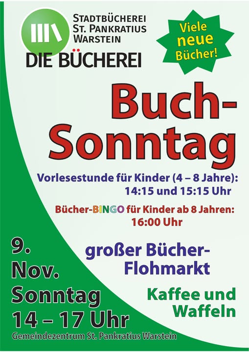 Die Stadtbücherei St. Pankratius Warstein lädt am Sonntag, 9. November 2025 wieder zum Buchsonntag ein. Von 14-17 Uhr ist die Bücherei im Gemeindezentrum zum Stöbern und Plaudern geöffnet. Viele neue Medien wurden angeschafft und können ausgeliehen werden. Auf einem Bücherflohmarkt werden zahlreiche ausgesonderte Bücher, darunter Sachbücher und Bildbände, Romane, aber auch viele Bilderbücher und Kinder- und Jugendbücher gegen eine kleine Spende abgegeben. Für die Kinder von 4 – 8 Jahren finden um 14:15 Uhr und 15:15 Uhr Vorlesestunden mit Bilderbuchkino statt, für die Größeren ab 8 Jahren wird um 16:00 Uhr vorgelesen und Bingo gespielt. Für das leibliche Wohl ist mit Kaffee und Waffeln gesorgt.