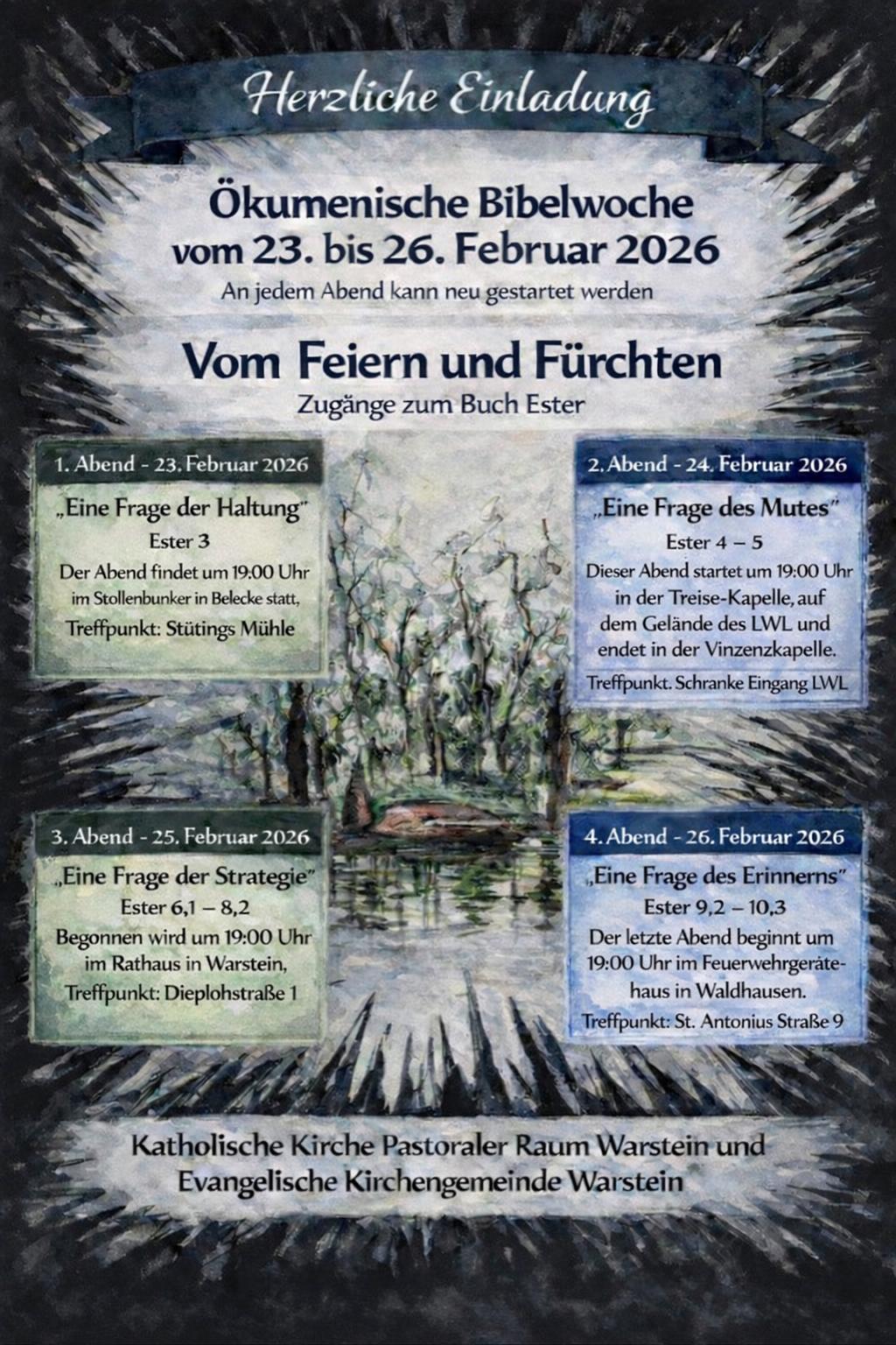 Auch in diesem Jahr laden die evangelische und katholische Kirchengemeinde wieder ein, sich an besonderen Orten mit einem ausgewählten Buch der Bibel auseinanderzusetzen. Diesmal geht es unter der Überschrift „Vom Feiern und Fürchten“ um das Buch Ester.